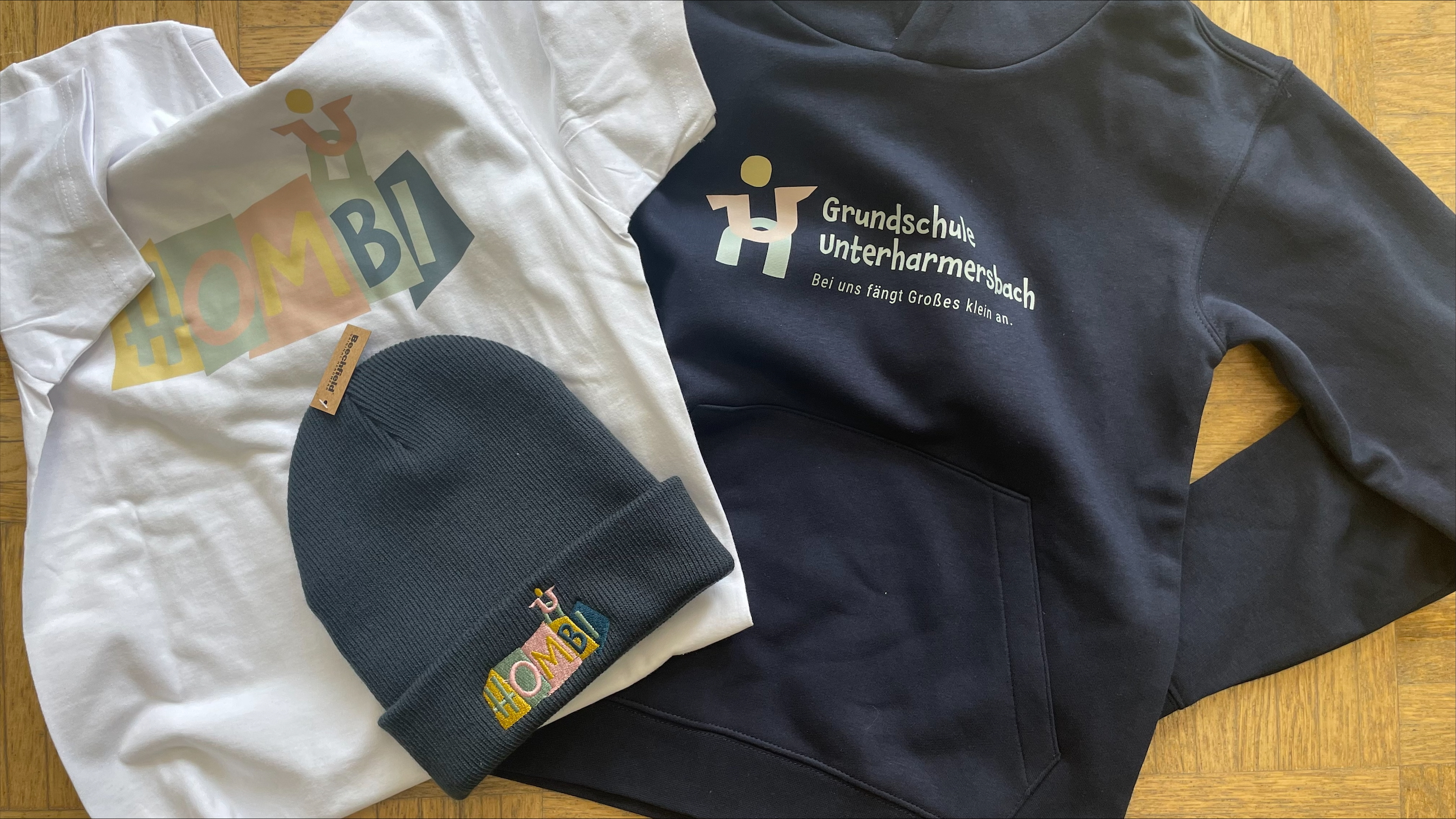 Es gibt T-Shirts, Hoodies und Mützen mit unserem Schullogo und Hombi.